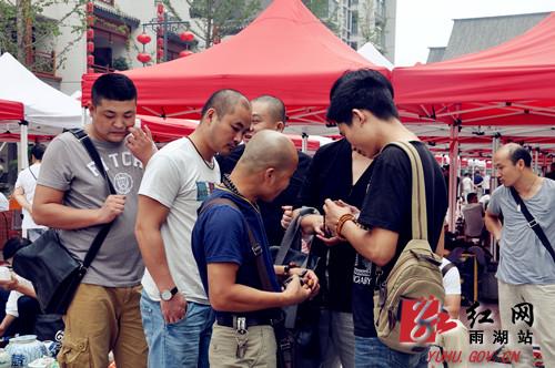 “和田玉吊墜,掛繩為小葉紫檀,雖然物件是現代的,但是小葉紫檀與和田玉的搭配充滿了古樸的味道,起價4500元,現在開始競價。”拍賣剛剛開始,現場便十分火熱,周邊陳列的展示柜也吸引了不少藏家的眼球,柜中陳列的珠寶、首飾、工藝品琳瑯滿目,官窯瓷器、翡翠玉石、各類彩寶爭相斗艷,翡翠或以陽綠取勝或以水種迷人;白玉以雕工亂眼,或以玉質奪目,吸引了眾多古玩愛好者。古玩街區與道路兩旁也擺滿了古玩字畫工藝品,為競買會增添異彩。